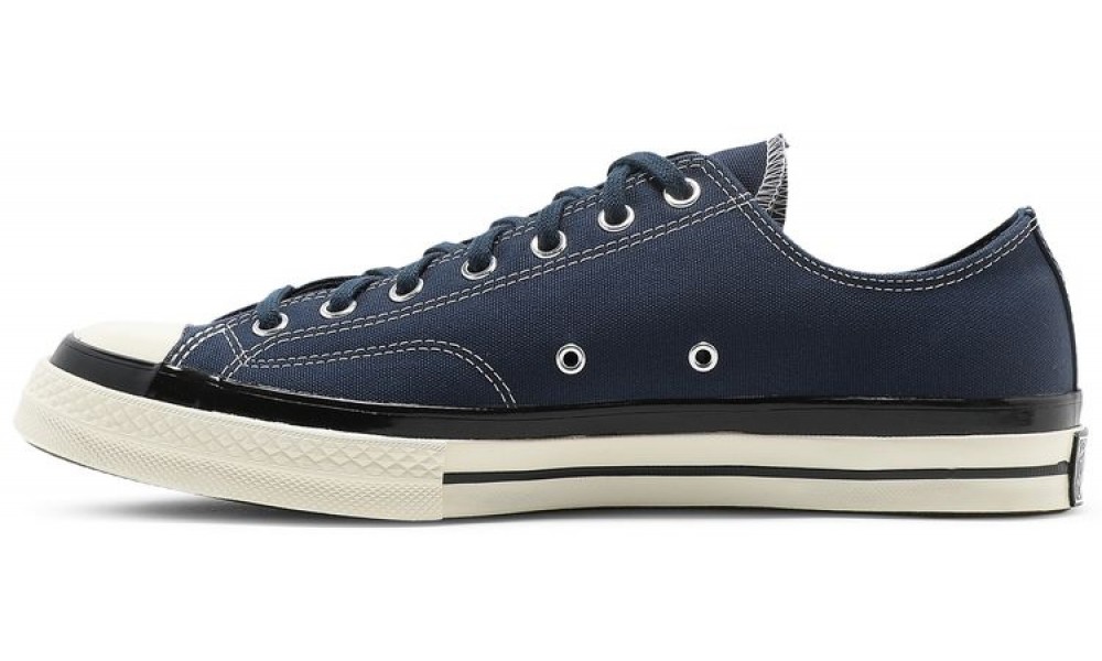 Модель Chuck 70 Low, признанная эталоном комфорта и стиля, получила уникальное переосмысление. Основой стал глубокий, благородный синий цвет (Insignia Blue) — отсылка к наследию Moncler. На боковую часть вынесен фирменный узор в виде ромба, узнаваемый символ бренда, выполненный с использованием премиальных материалов и безупречной вышивки.